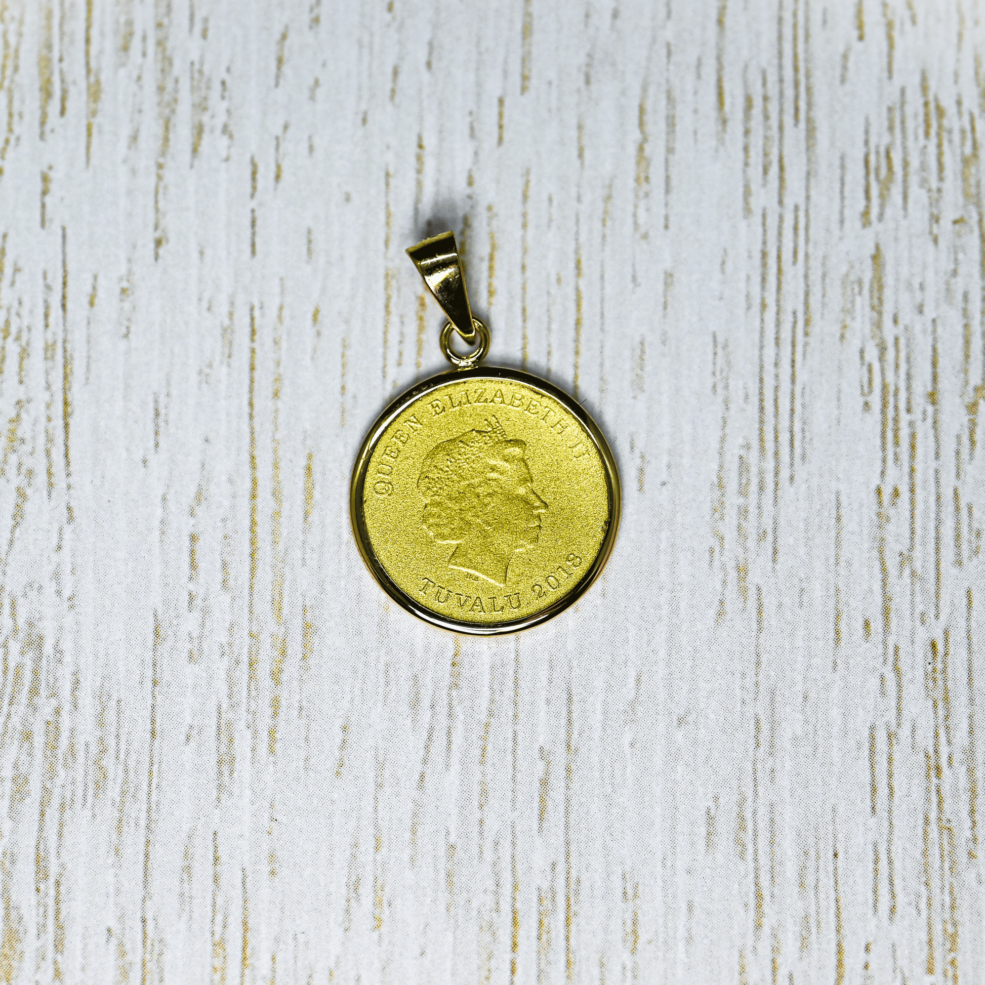 ツバル政府が発行した 24K純金のコイン を使用した、特別なペンダントトップです。表面には エリザベス2世女王の肖像、裏面には 天使のデザイン が精緻に刻まれ、歴史と芸術性を兼ね備えた逸品です。